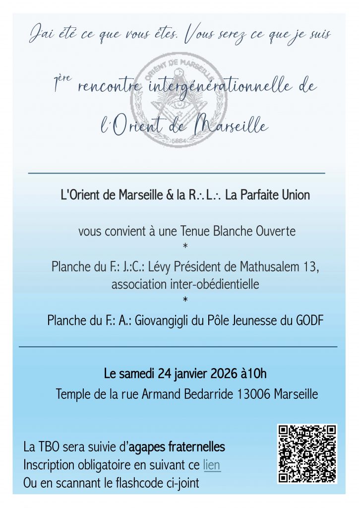 Nous organisons une Tenue Blanche Ouverte (à tous et profanes) intergénérationnelle le 24 janvier 2026, qui rassemblera Mathusalem13, association inter-obédientielle, et le pôle Jeunesse du GODF.