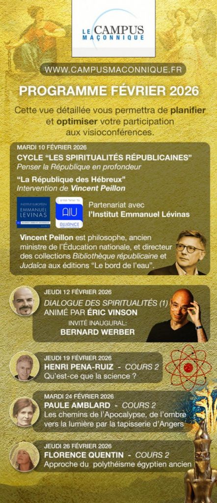 Campus Maçonnique: découvrez le programme de février avec comme nouveauté « les dialogues des spiritualités » animés par Eric Vinson Par Mathusalem-France28 janvier 202628 janvier 2026Culture